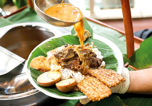 PAKET: Nasi dengan siraman kuah olahan rempah, tulang sapi, dan santan ini punya banyak isian lauk. Mulai berbagai macam bagian daging sapi hingga lauk pendamping. (Alfian Rizal/Jawa Pos)