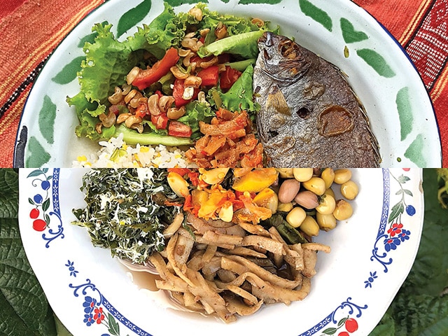 #LIFEINMOLLO: Sajian nasi jagung lauk ikan cara dengan tumis bunga pepaya, plus salada dan kacang serundeng. Menu jagung katemak, rebung tumis tauco, urap daun singkong, dan bakwan jantung pisang. (DICKY SENDA FOR JAWA POS)