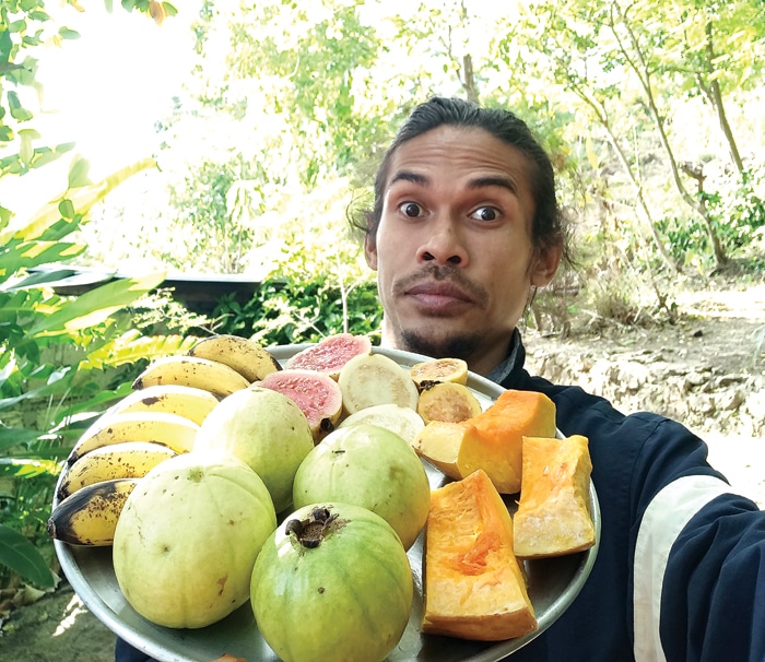 MUSIM BUAH: Dicky memarkan panen kujawas (jawambu, labu, jagung bose, kacang nasi, dan pisang mas pada akhir Mei lalu. (DICKY SENDA FOR JAWA POS)