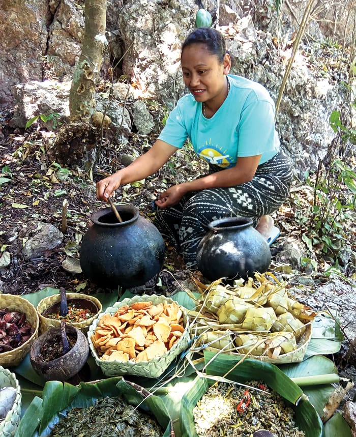 MNAHAT FE'U: Maman Fun menyajikan hasil masakannya dalam heritage trail Agustus lalu. (MARLINDA NAU FOR JAWA POS)