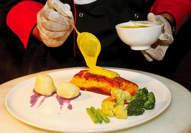 SAJIAN LENGKAP: Menu pan fried salmon with hollandaise sauce kreasi chef Andryas lengkap dengan sayuran dan karbohidrat yang diwakili mashed potato. (Robertus Risky/Jawa Pos)