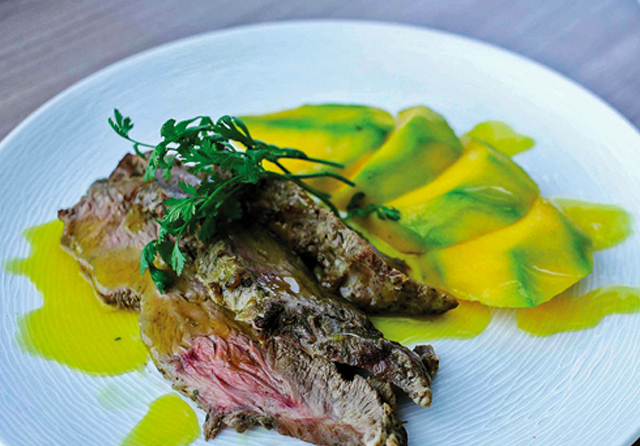 BUAH TROPIS: Potongan mangga segar menjadi pendamping sajian steak dengan daging sirloin ini. Penggunaan daging sirloin yang berserat menciptakan sensasi berbeda saat daging dikunyah. (Alfian Rizal/Jawa Pos)