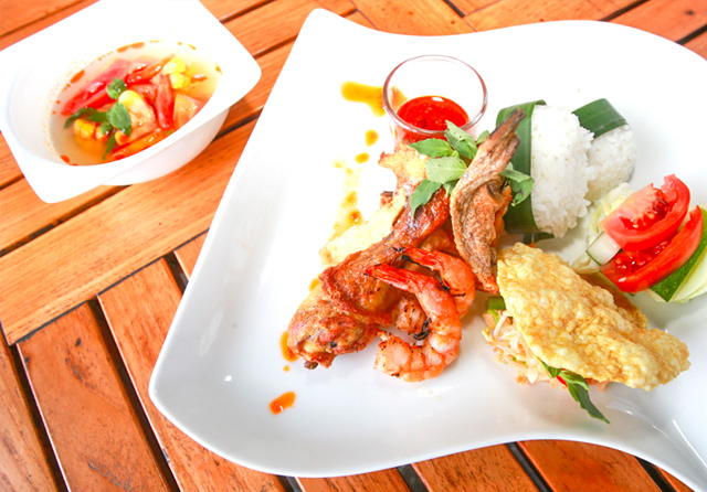 MENU LENGKAP: Udang yang telah di-grill melengkapi ayam ungkep goreng dalam sajian Sego Cindelaras. (Dimas Maulana/Jawa Pos)