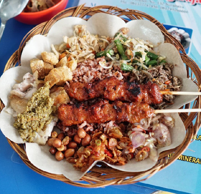 Nasi Campur merupakan nasi yang disandingkan dengan berbagai macam pilihan lauk pauk. Seperti urap bali, telur, suwir daging, sayuran, dan juga sate lilit daging ayam ataupun daging ikan.