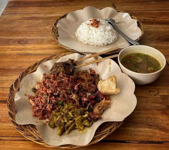 Nasi campur kuliner khas Bali ini biasanya dinikmati dengan aneka pilihan sambal yang diracik dengan bumbu khas Bali nan segar dan nikmat. Harga nasi campur mulai dari Rp 13.000 sampai Rp 23.000 seporsi.