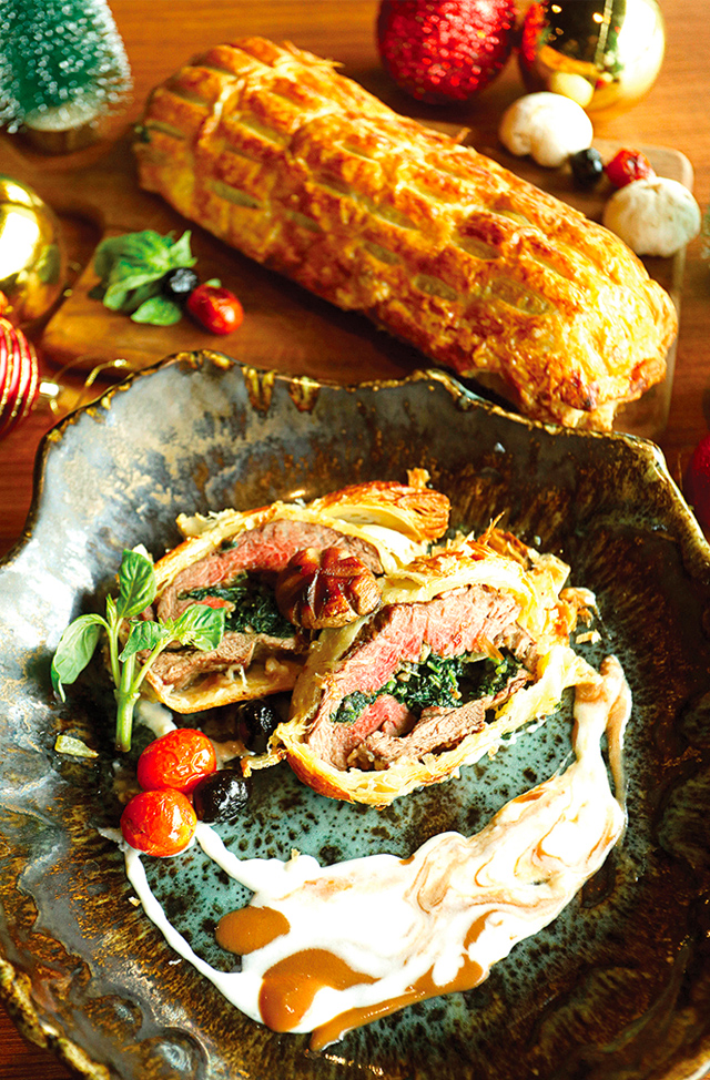 UNTUK menu utama, sous chef Royal Tulip Darmo Surabaya Dede Sundana menyiapkan beef Wellington khas Inggris. Menu tersebut memadukan renyahnya puff pastry dengan isian jamur-bayam dan daging yang lembut. Dia menyarankan tenderloin sebagai isian.