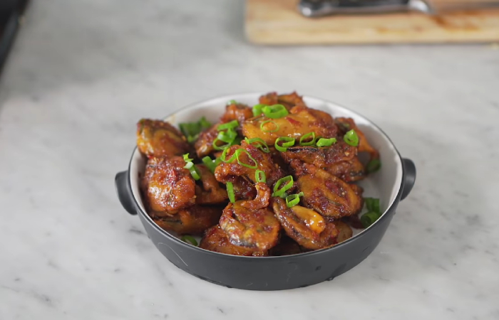 Makanan ini diolah dengan cara digoreng tepung yang disiram dengan saus yang gurih. Tekstur terong dibuat krispi diluar dan lembut di dalam yang membuat makanan ini terasa nikmat saat dimakan.