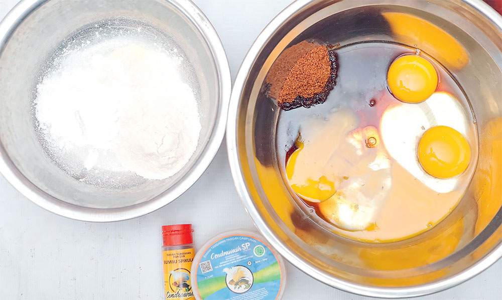 Kocok sekitar 3–5 menit hingga adonan berubah warna menjadi pucat dan konsistensinya lebih kaku. Masukkan fabiola paling akhir sebagai pengganti butter atau mentega. ”Tuang adonan ke dalam loyang sembari dientakkan untuk memastikan tidak ada celah udara,” chef Hansen mengingatkan.