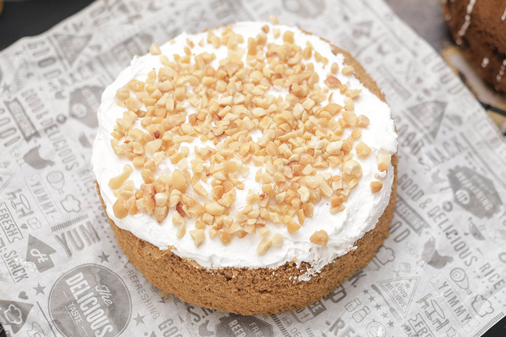 Tunggu bolu dingin sebelum mengolesinya dengan whipping cream. Taburkan kacang yang sudah disangrai dengan gula pasir sebagai topping. Aroma spekulas dan lembutnya bolu berpadu dengan tekstur kacang. (lai/c6/nor)