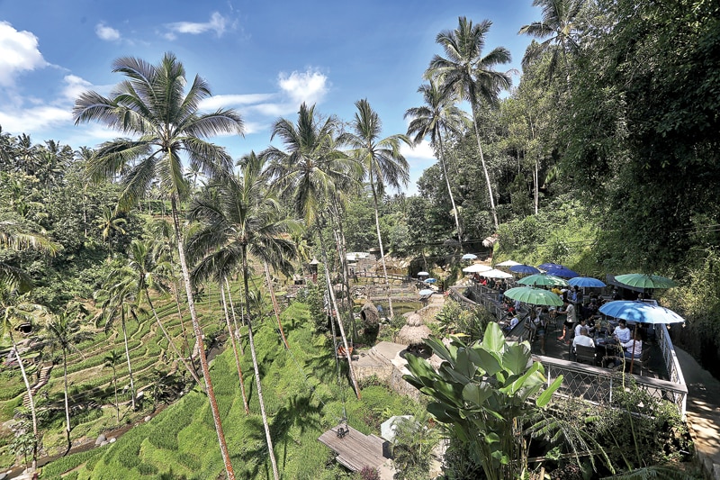 MENYEJUKKAN MATA: Wisatawan domestik menikmati pemandangan terasing sawah di kawasan Alas Harum, Ubud, Bali. Pulau Dewata menjadi salah satu destinasi wisata ketika liburan tiba